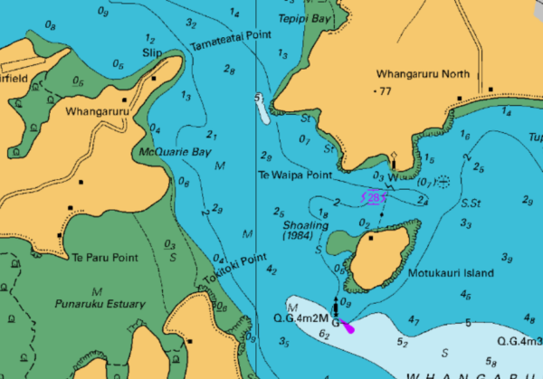 Nautical chart showing Whangaruru Harbour with Motukauri Island and Tamateatai Point. The hydrographic raster data made available through the LINZ Data Service is based on the Paper Navigational Charts published and maintained by the New Zealand Hydrographic Authority at Toitū Te Whenua Land Information New Zealand (LINZ).
